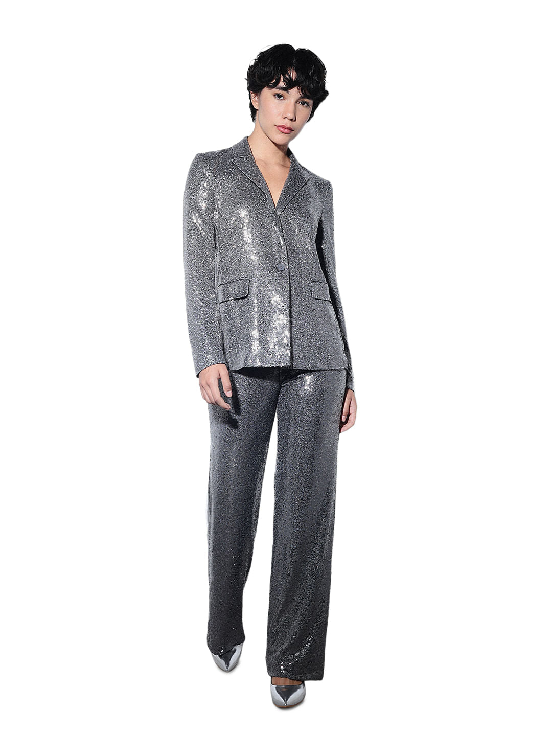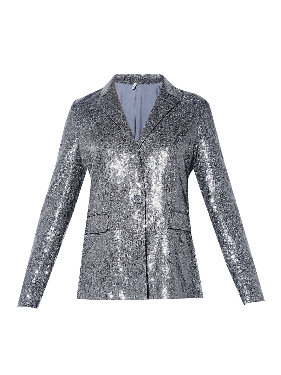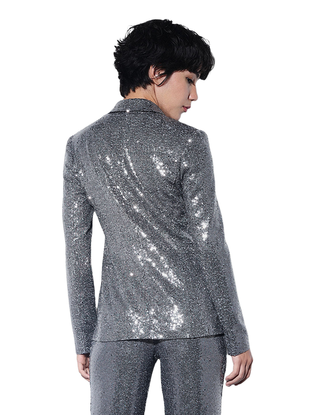 Step Into The Spotlight With This Dazzling Silver Single-Breasted Blazer, Designed To Bring A Little Extra To Your Wardrobe. Featuring A Shimmering Sequin Weave, This Stunner Is All About Making A Statement! With Sharp Peak Lapels And Sleek Concealed Press-Studs, It'S The Perfect Mix Of Glam And Sophistication. Padded Shoulders Bring That Power Vibe, While The Long Sleeves—Complete With Chic Slit Cuffs—Add A Little Edge. And Don'T Forget The Jetted Front Pockets With Flaps For A Dash Of Drama. Fully Lined For Comfort, This Blazer Is Ready To Shine With You, Anywhere You Go!