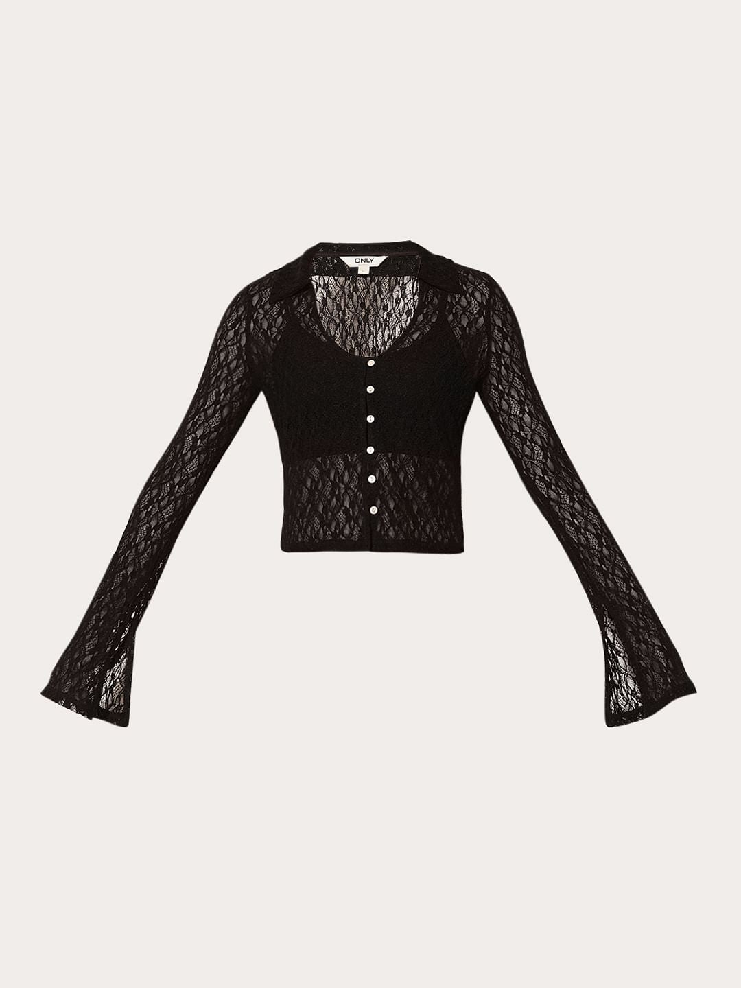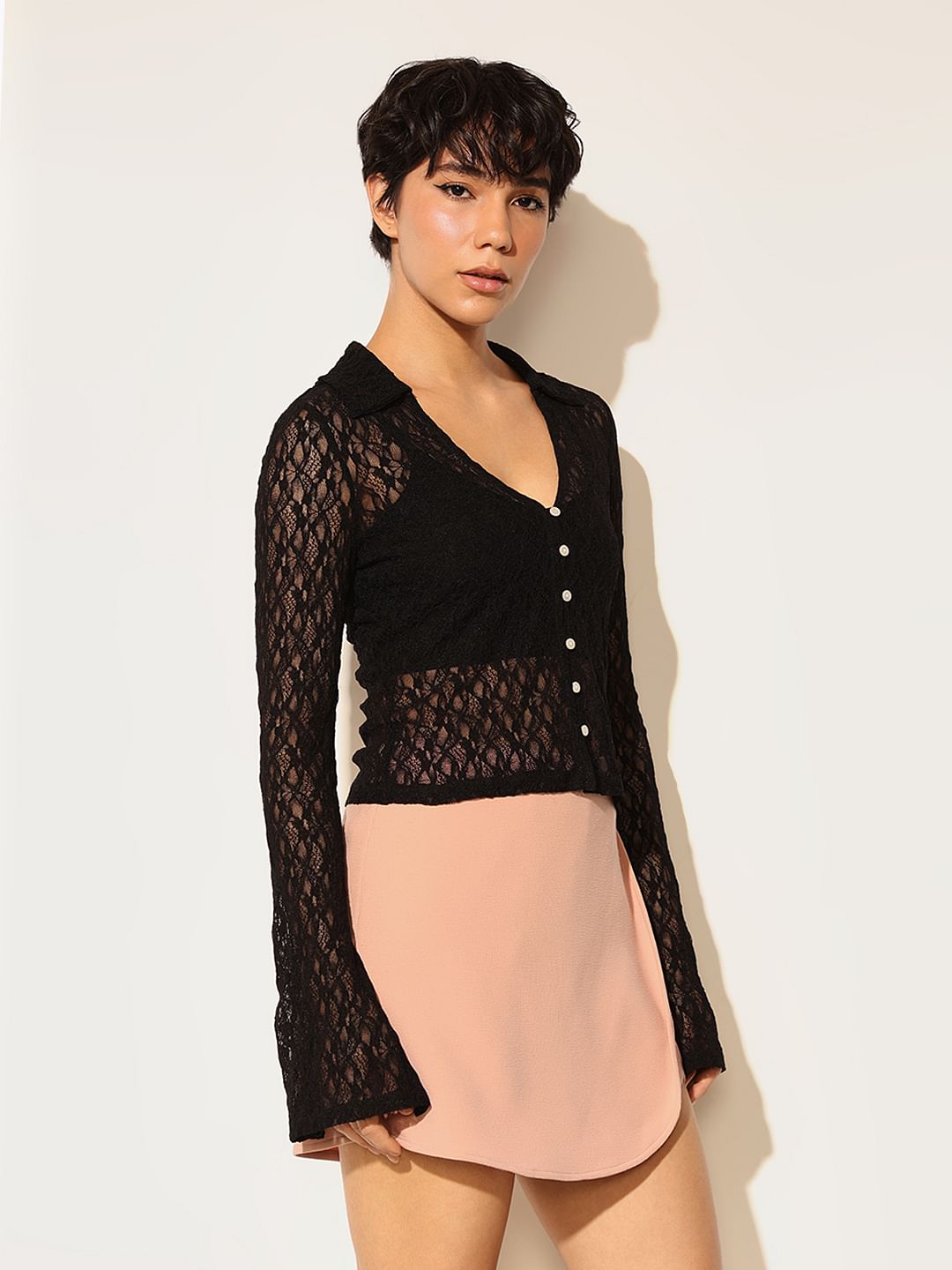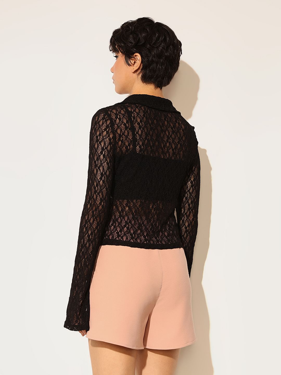 This Semi-Sheer Black Lace Top Is Your New Wardrobe Fave! With A Flattering V-Neckline And Long Sleeves, It&Rsquo;S The Perfect Balance Of Breezy And Bold. The Self-Design Pattern Adds A Touch Of Texture, While The Button Closure Brings It All Together. Wear It Now For A Chic Layered Look Or Pair It With Summer Vibes For Effortless, Fun Styling!