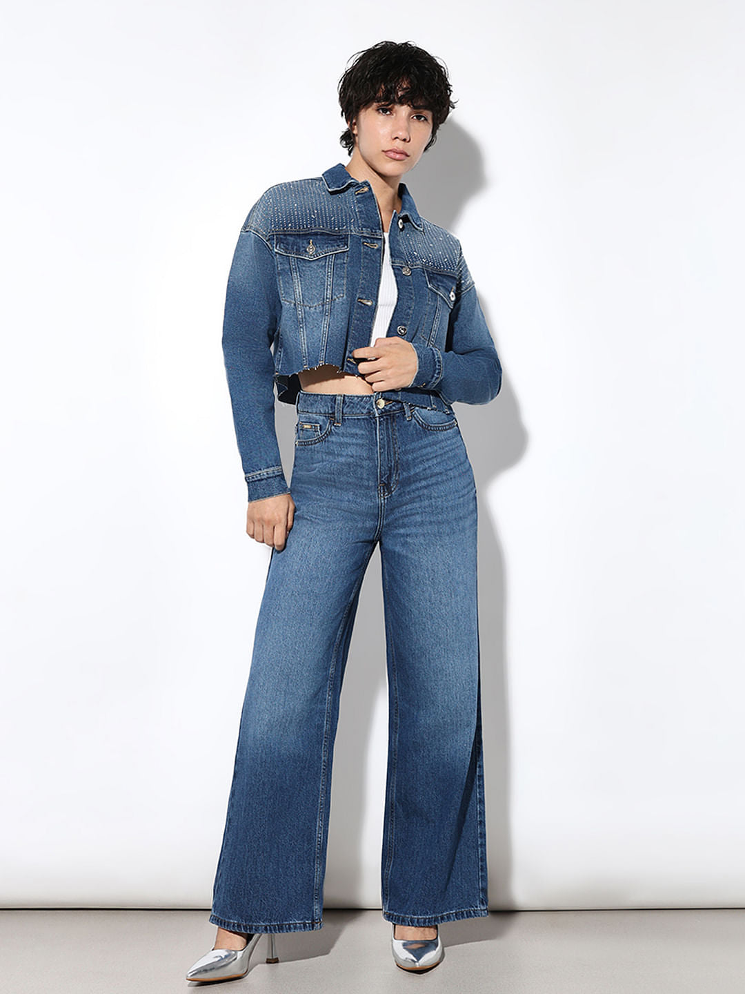 Add A Touch Of Sparkle To Your Wardrobe With This Cropped Cotton Denim Jacket! Featuring Rhinestone Details, A Classic Collar, And Button-Down Front, It&Rsquo;S The Perfect Blend Of Casual And Glam. The Low Dropped Shoulders And Buttoned Cuffs Give It A Laid-Back Vibe, While The Faux Chest Pockets Add A Fun, Playful Twist.