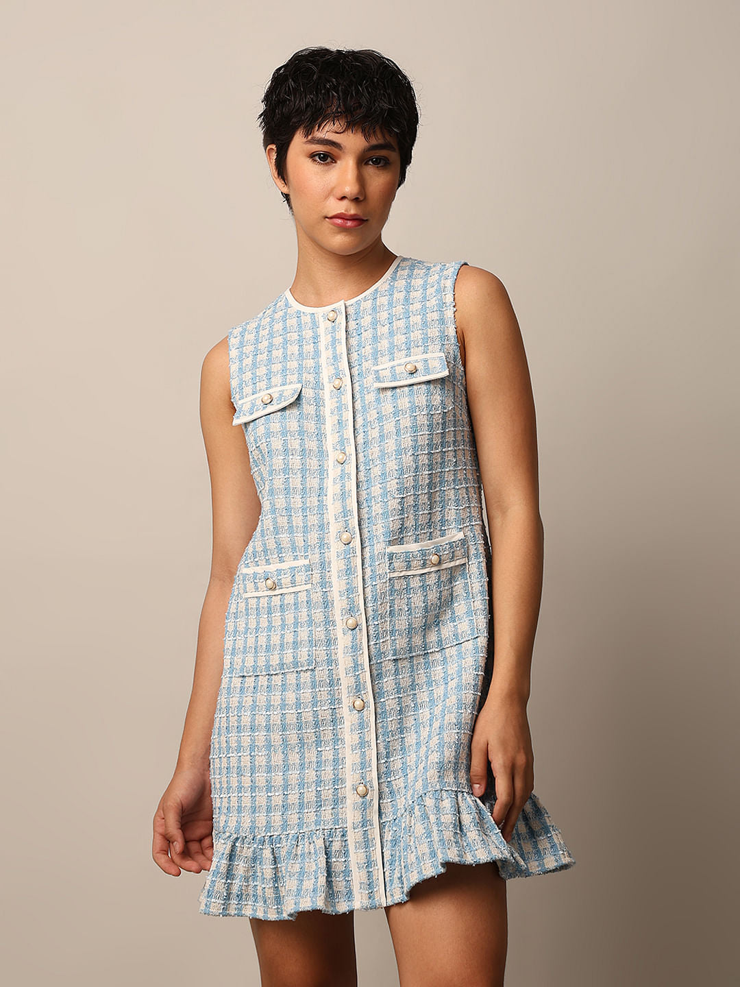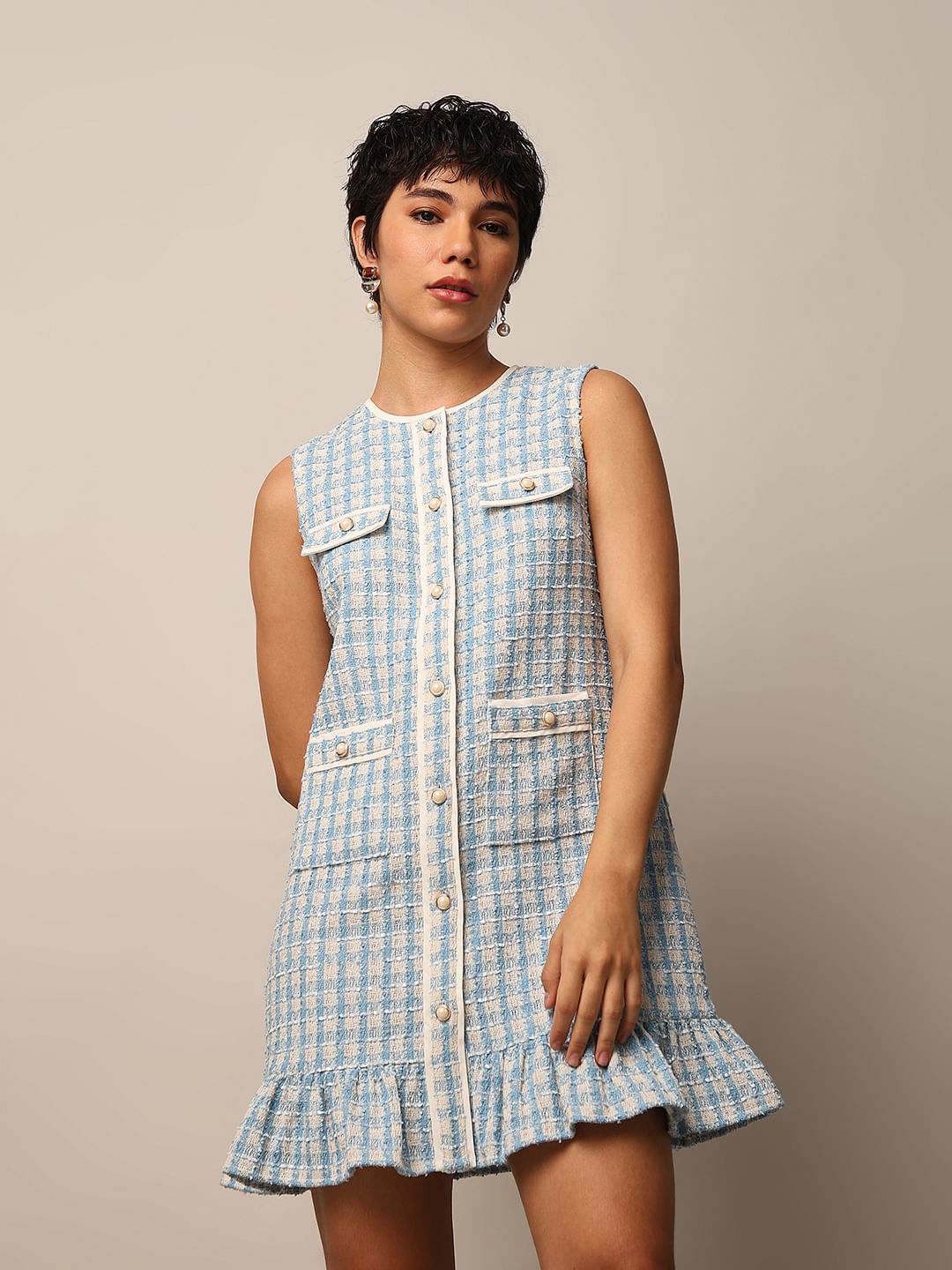 This Sleeveless Short Dress, Crafted In A Fabulous Tweed Weave, Is A Total Showstopper. Featuring A Sleek Round Neckline And Stylish Gold-Coloured Buttons Down The Front, It Oozes Sophistication With A Playful Twist. The Flap Fake Chest Pockets Add A Bit Of Fun, While The Functional Front Waist Pockets Are Perfect For Stashing Little Essentials (Or Just Pretending). With Waist Seam Detailing And A Flirty Frill Hem, This Unlined Beauty Is All About Turning Heads And Keeping You Comfy.