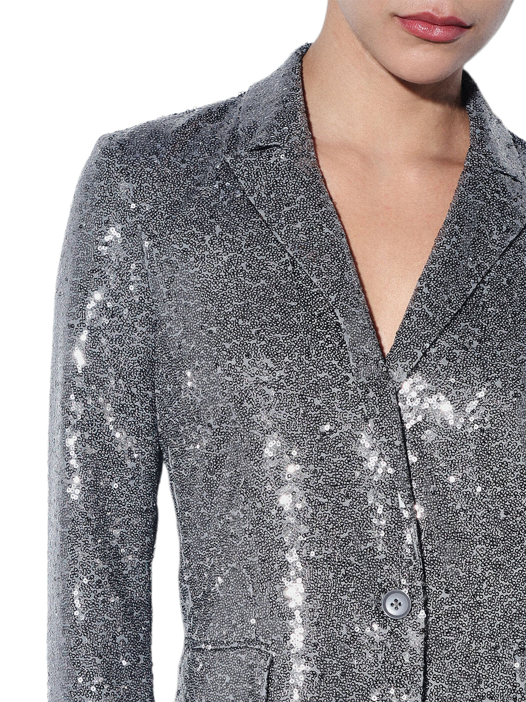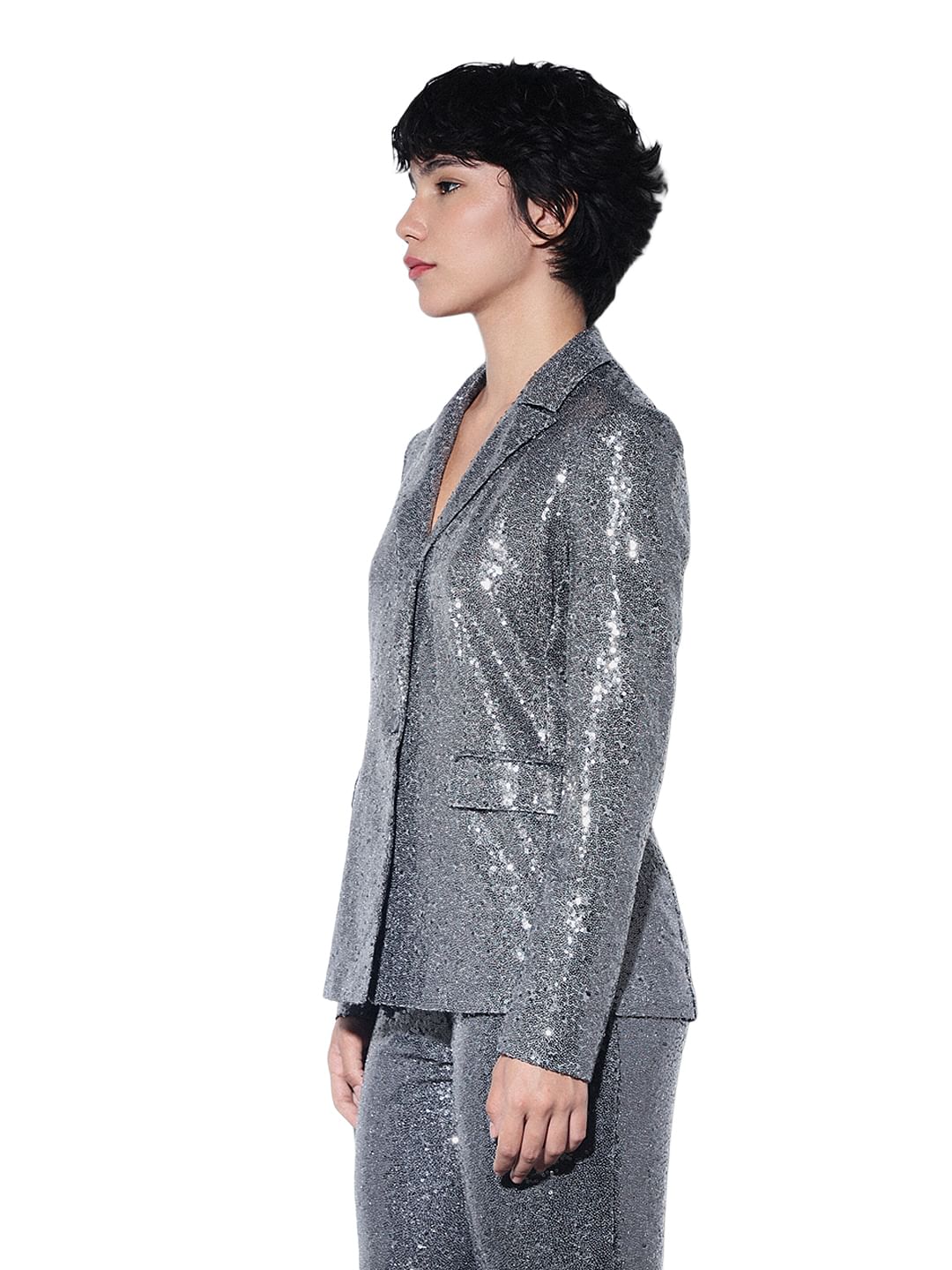 Step Into The Spotlight With This Dazzling Silver Single-Breasted Blazer, Designed To Bring A Little Extra To Your Wardrobe. Featuring A Shimmering Sequin Weave, This Stunner Is All About Making A Statement! With Sharp Peak Lapels And Sleek Concealed Press-Studs, It'S The Perfect Mix Of Glam And Sophistication. Padded Shoulders Bring That Power Vibe, While The Long Sleeves—Complete With Chic Slit Cuffs—Add A Little Edge. And Don'T Forget The Jetted Front Pockets With Flaps For A Dash Of Drama. Fully Lined For Comfort, This Blazer Is Ready To Shine With You, Anywhere You Go!