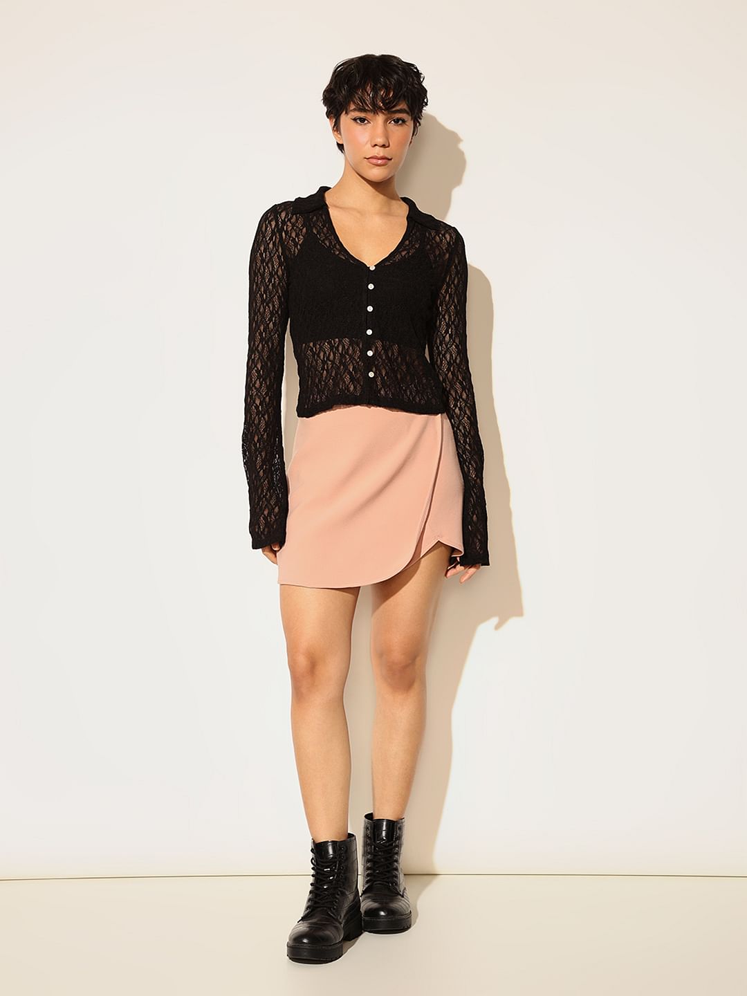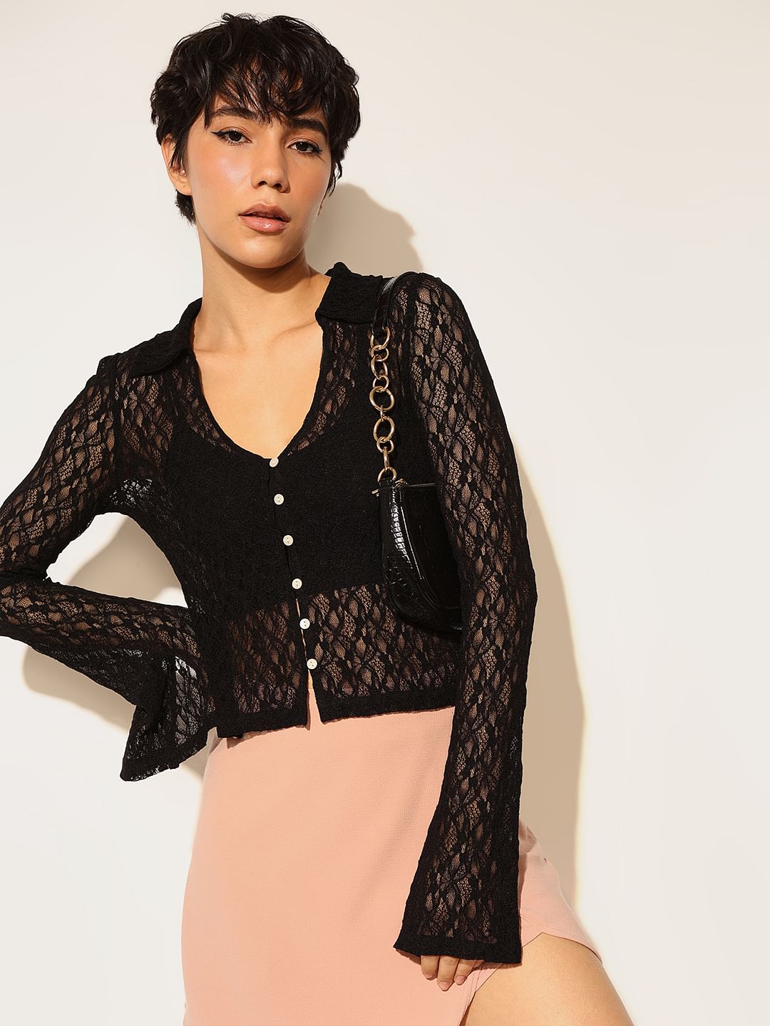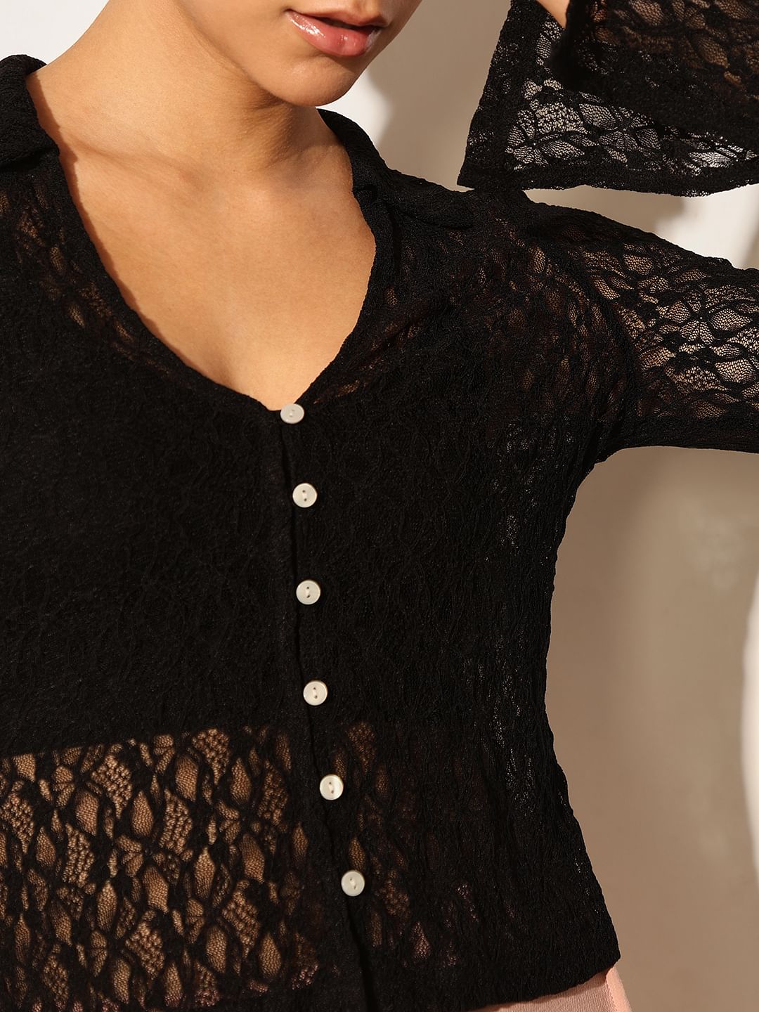 This Semi-Sheer Black Lace Top Is Your New Wardrobe Fave! With A Flattering V-Neckline And Long Sleeves, It&Rsquo;S The Perfect Balance Of Breezy And Bold. The Self-Design Pattern Adds A Touch Of Texture, While The Button Closure Brings It All Together. Wear It Now For A Chic Layered Look Or Pair It With Summer Vibes For Effortless, Fun Styling!