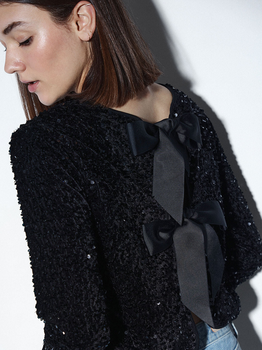 Get Ready To Sparkle And Shine With This Fabulous Fitted Top! Made From Sequined Jersey, This Crop Top Dazzles With Its Boat Neck At The Front And A Big Bow-Tiful Surprise At The Back. Long Sleeves? Check! Lined For Extra Comfort? Double Check! Perfect For When You Want To Add A Touch Of Glam And A Sprinkle Of Fun To Any Outfit. Who Says You Can&Rsquo;T Have It All?