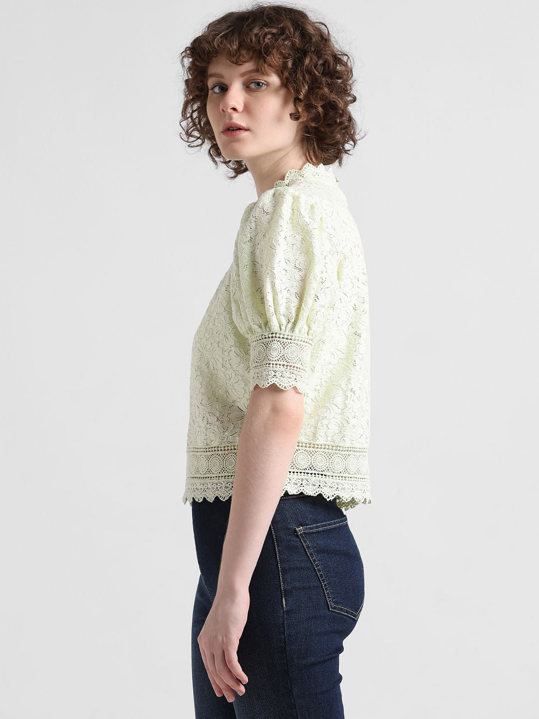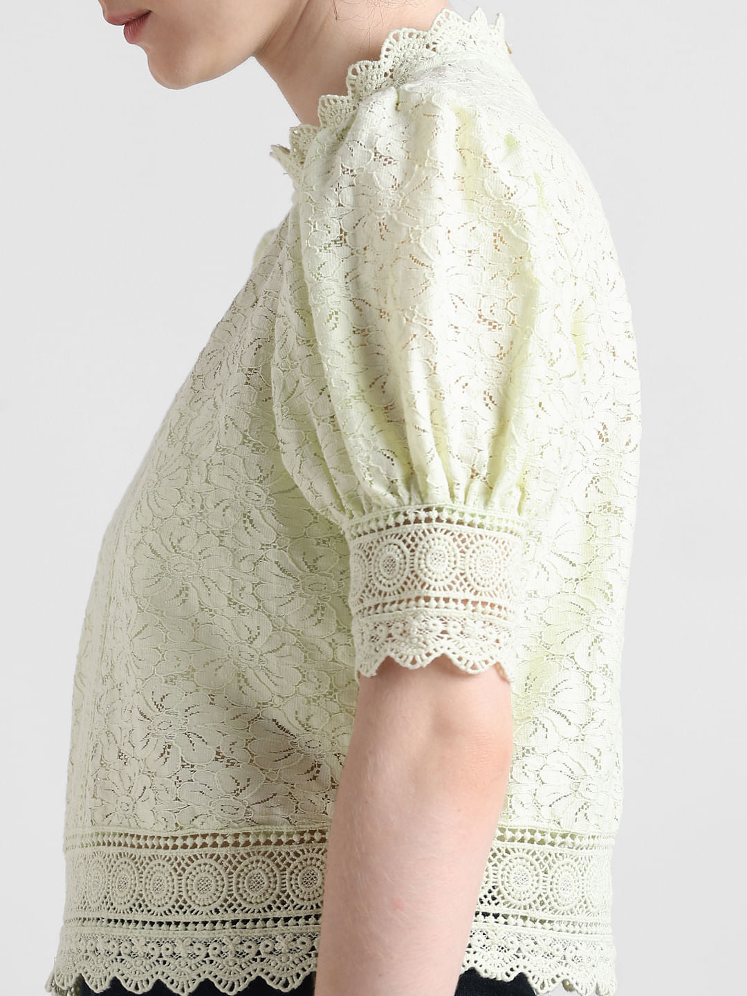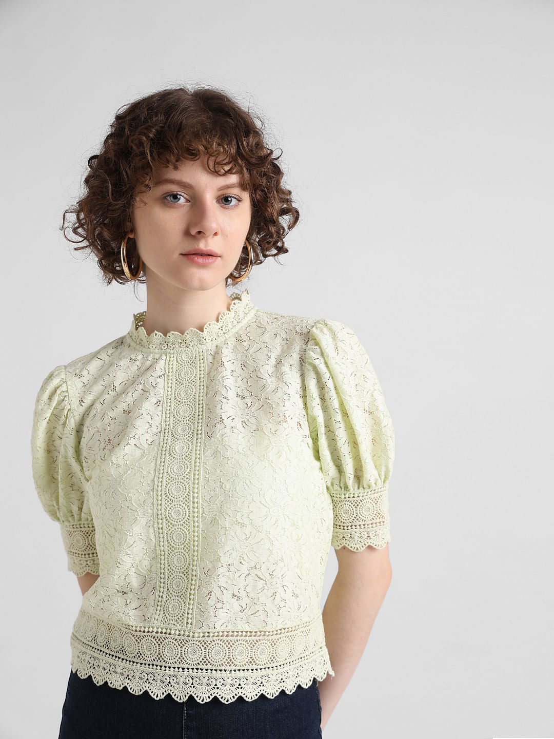 This Beautiful Lace Top By Only Is Perfect For Any Occasion. The Scallop-Edged Stand-Up Collar, Keyhole Opening With A Button At The Back Of The Neck And Short Puff Sleeves Make This Top So Feminine And Unique. The Frill Trims Down The Front Add Texture And Style To This Timeless Piece. Wear It With A Pair Of Skinny Jeans And Flats For A Casual Day Look, Or Dress It Up With A Midi Skirt And Heels For An Evening Out.