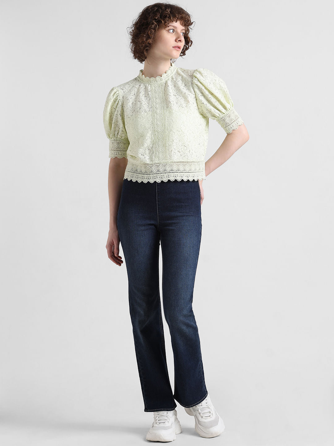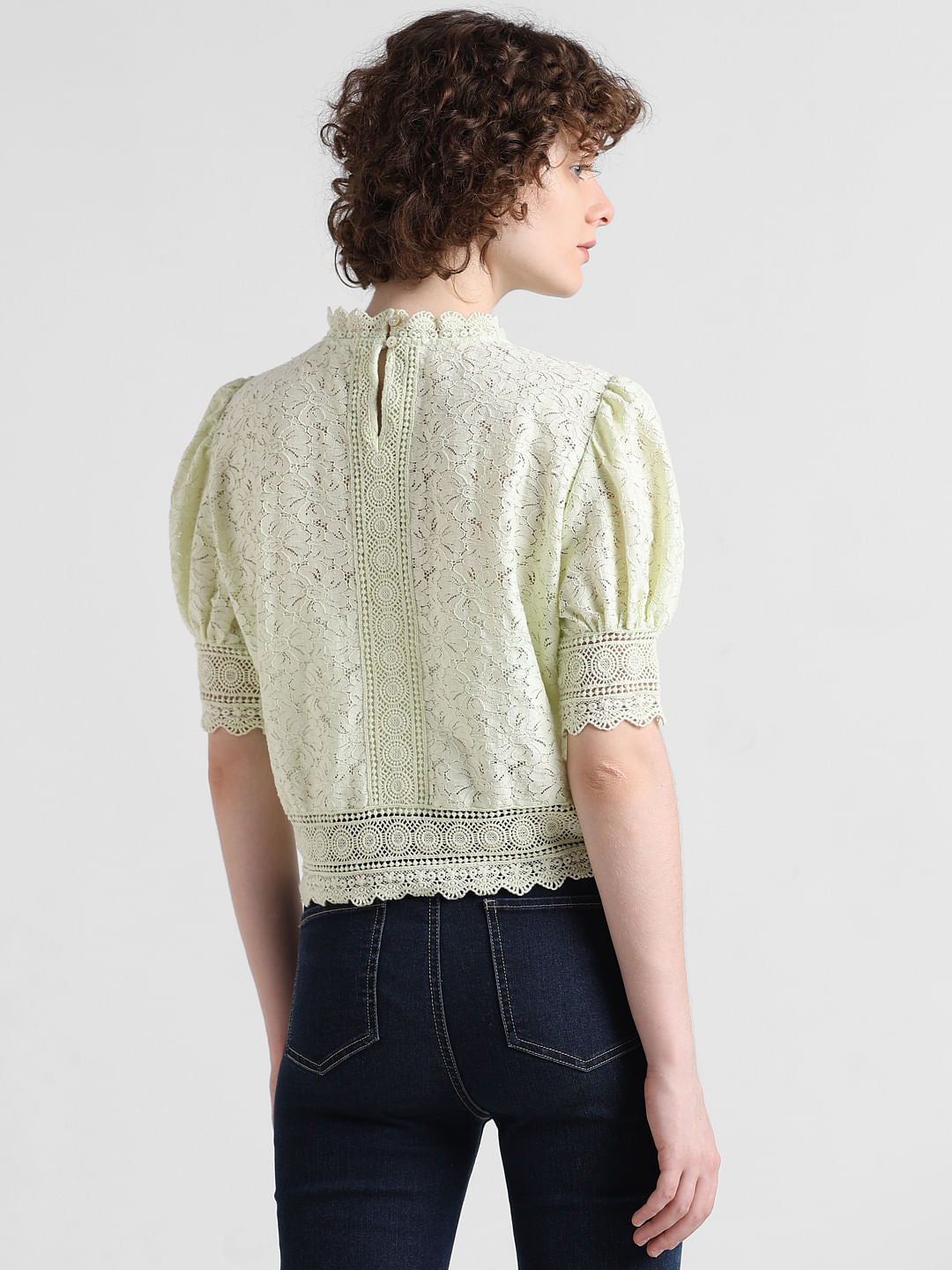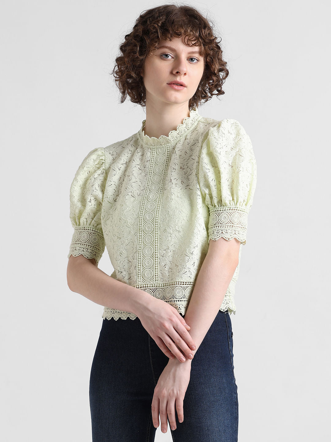 This Beautiful Lace Top By Only Is Perfect For Any Occasion. The Scallop-Edged Stand-Up Collar, Keyhole Opening With A Button At The Back Of The Neck And Short Puff Sleeves Make This Top So Feminine And Unique. The Frill Trims Down The Front Add Texture And Style To This Timeless Piece. Wear It With A Pair Of Skinny Jeans And Flats For A Casual Day Look, Or Dress It Up With A Midi Skirt And Heels For An Evening Out.