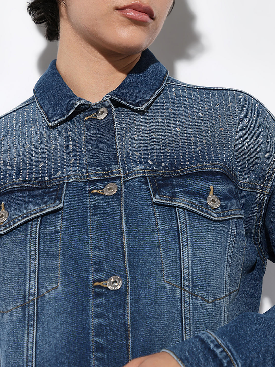 Add A Touch Of Sparkle To Your Wardrobe With This Cropped Cotton Denim Jacket! Featuring Rhinestone Details, A Classic Collar, And Button-Down Front, It&Rsquo;S The Perfect Blend Of Casual And Glam. The Low Dropped Shoulders And Buttoned Cuffs Give It A Laid-Back Vibe, While The Faux Chest Pockets Add A Fun, Playful Twist.