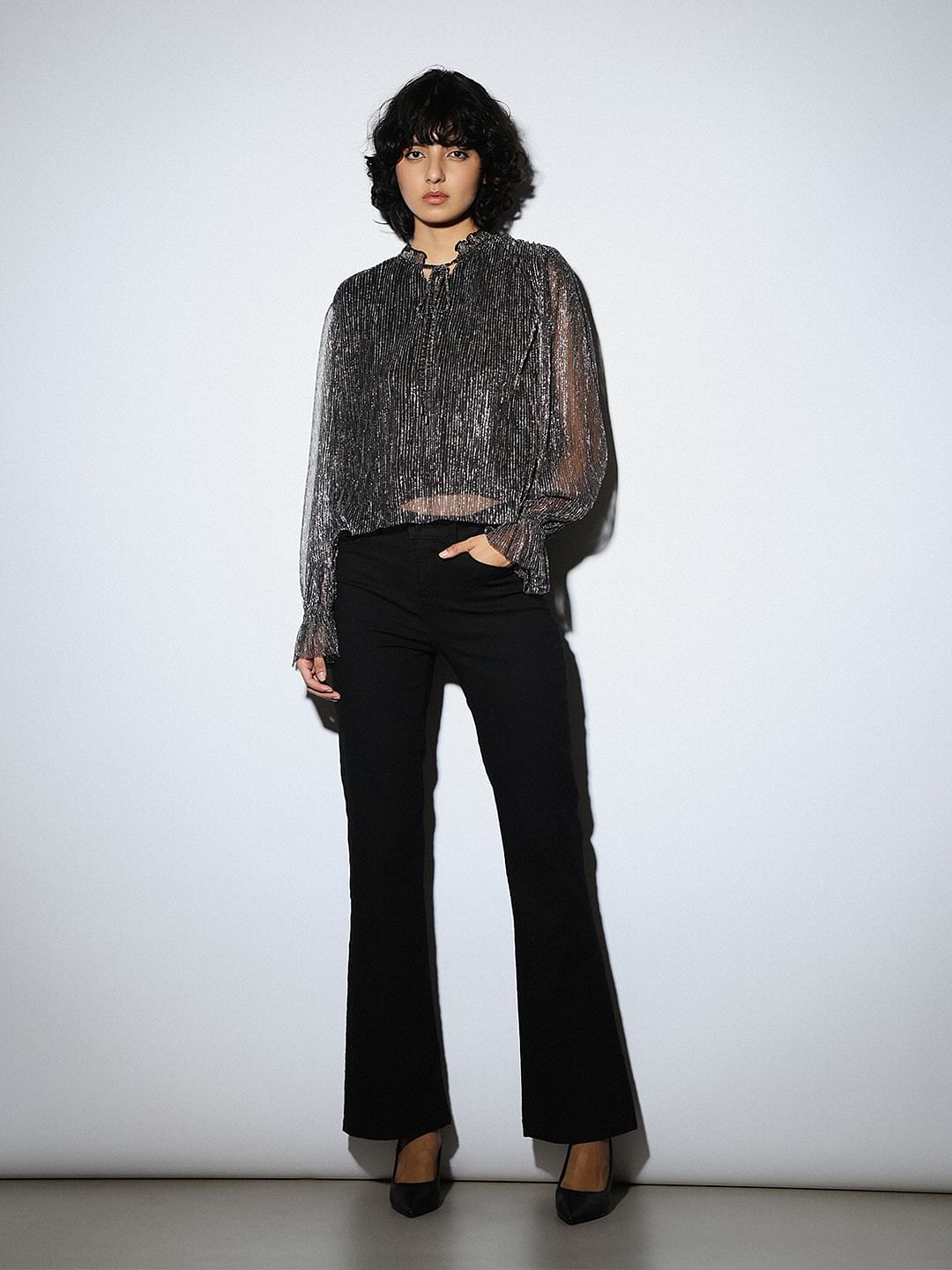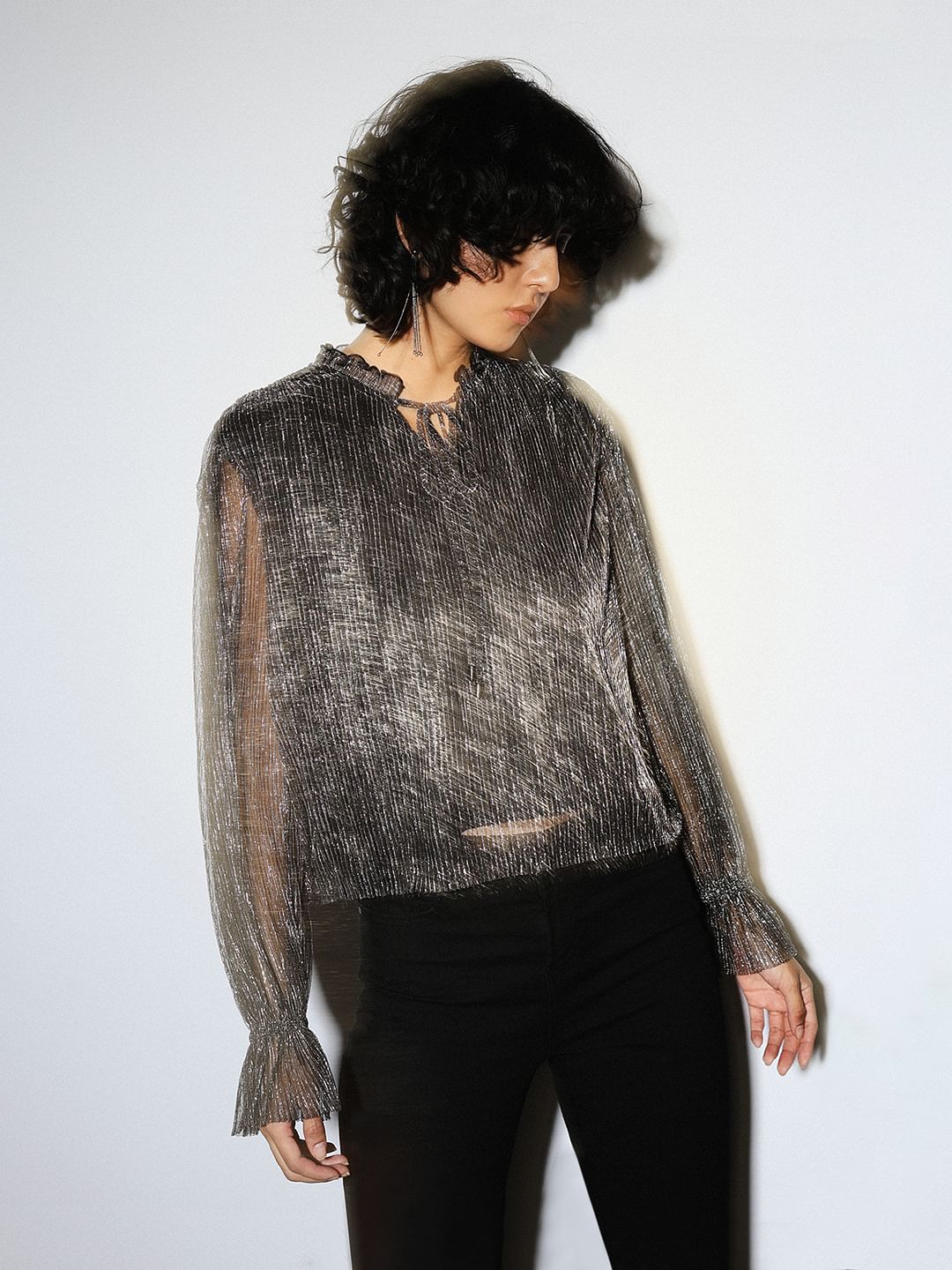 Get Ready To Dazzle In Our Shimmer Top Crafted From Pleated Metallic Fabric That Catches Every Glimmer. Featuring A Small Frill Neck With Chic Narrow Ties That Crisscross For A Playful Touch, This Top Is All About The Details. Long Sleeves With Narrow Elastic Cuffs Add A Touch Of Comfort And Style, Making It Perfect For Dancing Through The Night Or Adding Some Sparkle To Your Daytime Look.