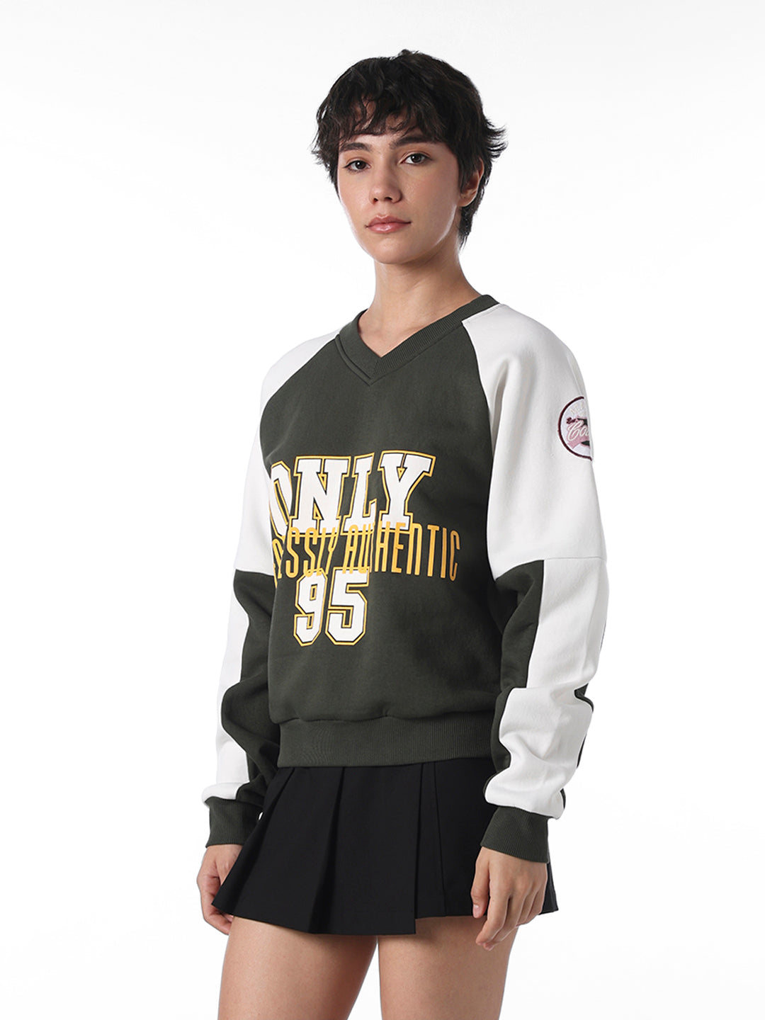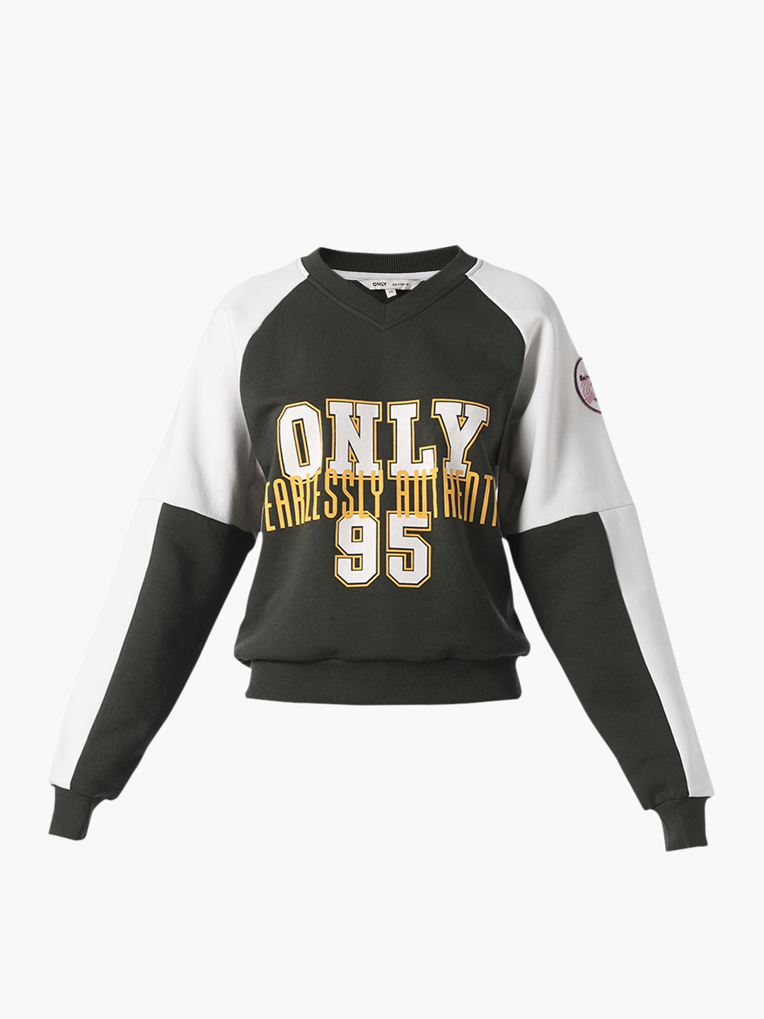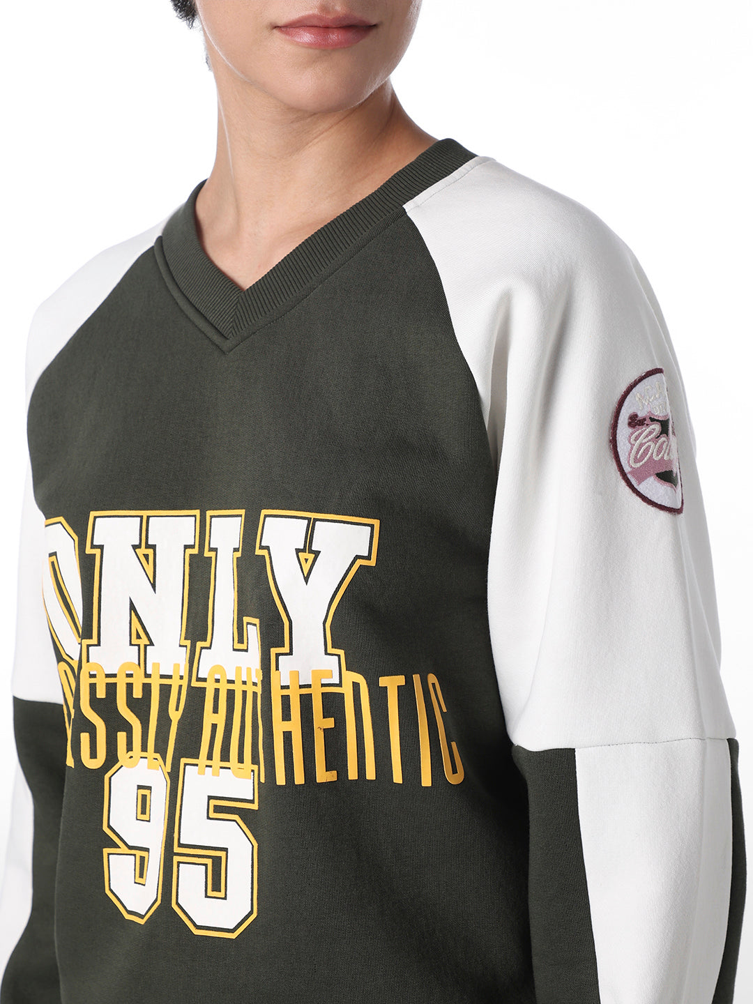 Level up your laidback look with this green printed sweatshirt. It’s got a soft, brushed feel on the inside, a cool V-neckline with rib trim, and relaxed raglan sleeves. Finished with wide ribbed edges for that effortlessly snug fit.