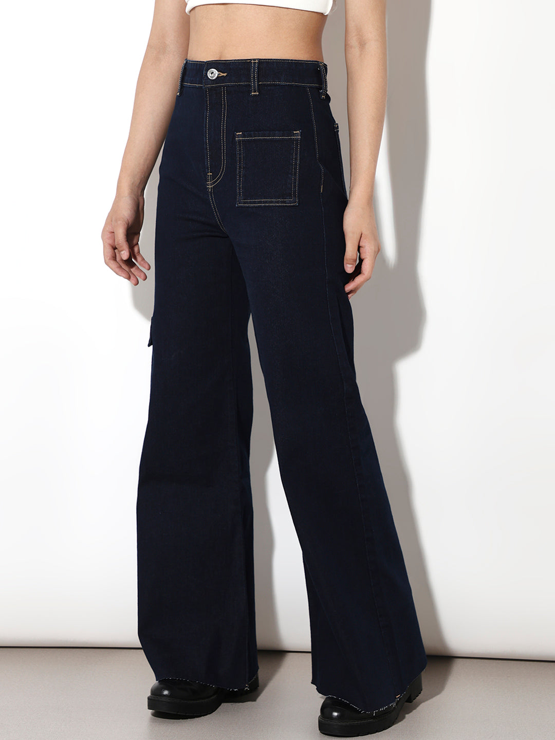 Bootcut but make it bold. These dark blue cargo jeans bring together a flared leg, high waist, and raw-cut hem for that laid-back edge. With roomy pockets (yes, actual ones) and a loose fit all the way through—this one’s made to move with you.